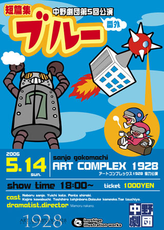 ■ 公演情報 日時:2006年5月14日(日)18:00〜 場所: ART COMPLEX 1928 (京都市三条御幸町) 上演時間:90分 ■ 作品ラインナップ 1 エスカレーター エスカレーターに閉じ込められた二人のサラリーマンの話。一番最初に完成した短篇だと思う。短篇集大山崎をやるずっと前にできていた。 2 節ちゃん もともとは女性二人が演じてるところをイメージして書いたものであって、けっしておっさんが節ちゃんをやることで笑いを取るという類のものではなかったし、今でもそれは違うと思っている。 3 ランドセル 放課後小学校に呼び出され、会社からかけつけた六島君の父親。担任は、クラスの女子の給食袋が紛失したため、六島君のランドセルの中身を調べた。ウェブコント『エコタンク』用に書いた脚本を、逆輸入的に上演。絞り出すように書いてたなあ。 4 録画 今回の公演のために書き下ろした脚本。 5 クローン 2005年10月15日 Y2S企画 第1回公演『Snow Dome』にゲスト出演した際に使用した脚本。結構自分でもいい感じに本ができたので、『ブルー』をやると決めた時にこの演目は加えるべきだと思った。当時のキャスティングのまま、一部改良を加えてやってみた。 6 たこさんいかさん こんなに力抜いて作ったものも珍しい。車の中で運転中に思いついて、忘れる前に録音した。 7 ベビーカステラ とにかく稽古中何度も本を修正しまくった。結果ちょっといい感じになった。 8 オランウータン これも書き下ろし。エチュードから作ることってあんまりなかったけど、本が書けない時は、こういう作り方もいいなという、素敵な発見があった。 9 ブルー 表題作です。表題作にしたからラインナップに加えざるをえなくなった。 10 強制小学生 個人的には一番のお気に入りの脚本。 ■ キャスト ![]() 加藤祐一 三条上ル 白木ぽん太 唐仁原俊博(喀血劇場)* 川渕幸治郎* 亀岡大祐(SK Product Co.)* 土屋たえ* (*=ゲスト) ■ スタッフ 作・演出:中野 守 照明:寺澤哲(立命芸術劇場) 音響:村川謙一 衣裳:土屋たえ 小道具:白木ぽん太 宣伝美術:いぬしげ 制作:三条上ル、加藤祐一 ■ 協力 ART COMPLEX 1928 ■ 演出家挨拶(パンフ掲載文) 本日はお忙しいなか中野劇団のために貴重なお時間を頂戴しまして誠にありがとうございます。脚本・演出担当の中野守です。 今回また短篇集やらせていただくことになりました。 第2回公演 短篇集『大山崎』以降に書いた短篇のストックがちょっとできてきたのでそれらを中心に、あと書き下ろしの新作短篇1本の計8本です。 いつの間にやら結構書いたものです。 しかし、今回で5回公演なのに、そのうち短篇集が2回。その2回合わせて23本の短篇って。これじゃまるっきりコント集団ですね。 最近は「エコタンク」を見て我々の存在を知って下さった方もいらっしゃるようで今日この会場に、初めて生の演技をご覧になられる方もおられるかも知れませんが、「ライブっていいものだ」と思っていただけるような そんなきっかけ作りができる舞台になれば、そんな思いを込めて本番頑張ります。ま、頑張りますって言っても、僕はどこかで隅っこの方で舞台見てるだけなんですけどね。 どうぞ最後までごゆっくりお楽しみ下さいませ。 ■ 公演を終えて アートコンプレックス1928の3階の窓から外を見下ろした時の光景を思い出す。記憶に残る行列。 当時は、幕が上がるかという不安と、冷静に動けない不甲斐なさでいっぱいいっぱいだった。 今でも待たせてしまった申し訳なさと共に思い出してしまうけど、あれだけ沢山見に来てもらえたことは本当に嬉しい。 ホントに貴重な劇場だ。アクセスの良さ、そしてあの広さ。内々のことを言わせてもらえば、打ち上げの場所を探しやすいこととか。 短い稽古期間だった。 2ヵ月というのは自分の中では本当にありえない。演目に関して言えば準備不足というわけではなかった。「これでどうだ」という気持ちはあった。まあ、実際やった後で多くの反省点はいろいろ出てきた。客席のこととか。見せ方とか。「エスカレーター」は完全な暗闇の中でしてもよかったかもとか。それを、短篇集『不埒』の『課長のお目玉』で採用するわけで。 1日のみの小屋入り、1ステージのみの公演というのも初めてのことで、それはそれはドキドキものだった。 いい役者と一緒にできたなと、ホント今思ってもありがたい。稽古時から全員モチベーションが高かった。演出もやりがいがあった。 エコタンクのアニメで先にネタばれしてしまっているもので、通用するのかどうかという葛藤は最初から最後まであったけど、そんな経験をしたこともなかったから、やってみてもいいかなと思った。折角書いたからやっぱりライブでやりたかったし。 とにかく終わった後出演者らでご飯食べに行ってみんなが幸せそうだったのが何より報われた。(文:中野) |