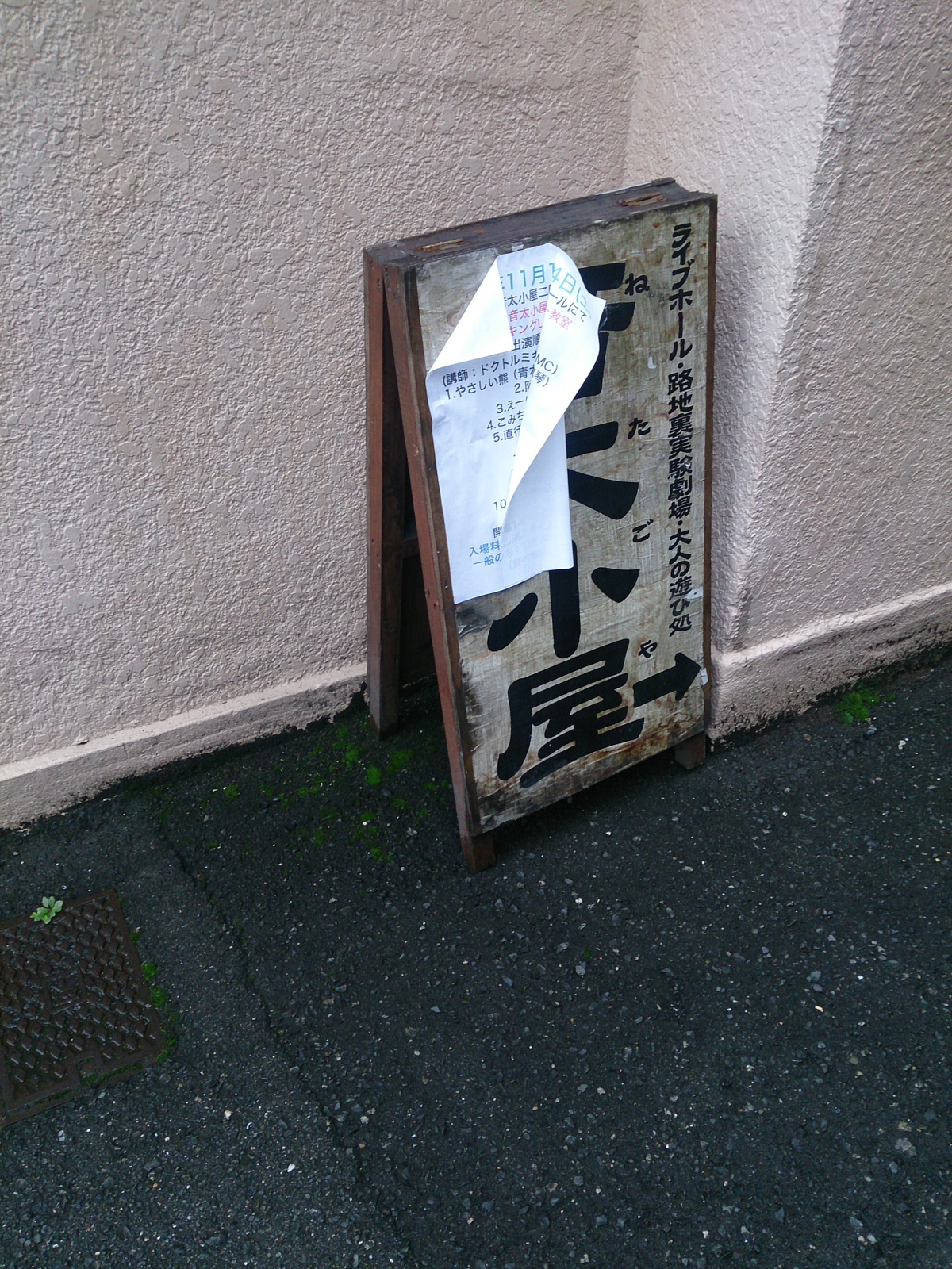 短篇集『趣味と実害』 劇場への行き方 ![]() 地下鉄谷町線天神橋筋6丁目駅東改札を出たところ ![]() 東改札を出て右へ。①出口へ。 ![]() 東改札すぐ近くの案内図 ![]() まっすぐ突き当りまで進みます。 ![]() まっすぐ。 ![]() 突き当りを右へ。 ![]() 右へ曲がると階段が見えます。 ①出口の階段です。 ①出口を出るとすぐにファミリーマートが見えますが、 劇場は後ろ側です。 ![]() 180度回るとこの景色。右側が今のぼってきた階段。 ここをまっすぐ進みます。 ![]() ローソン100の横をすり抜けます。 ![]() まっすぐ。 まっすぐ。ちょっと見づらいですが、BARの看板がすでに見えています。 ![]() 美味しそう。 ![]() 作りかけのバス停。SHOT BARの看板があります。 ![]() 道路の反対側には天下一品があります。 ![]() このSHOT BARの看板を右へ曲がります。 ![]() おや? 足もとに。 ![]() 音太小屋さんの看板がありました。 ![]() SHOT BARの看板を曲がった景色です。この先に音太小屋さんがあります。 ![]() 見えてきました。 ![]() 劇場前はこんな感じです。写真左上にある赤い矢印の看板の方へ ![]() 到着です。